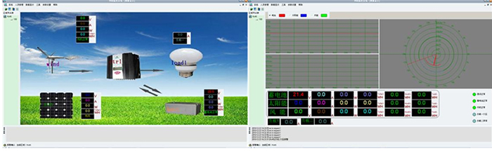 ◆ 顯示內容:蓄電池電壓、風機電壓、光伏電壓、風機電流、光伏電流、風機功率、光伏功率,能量模擬圖,當前風速(米/秒),當前風向(度),當前風力資源平估。