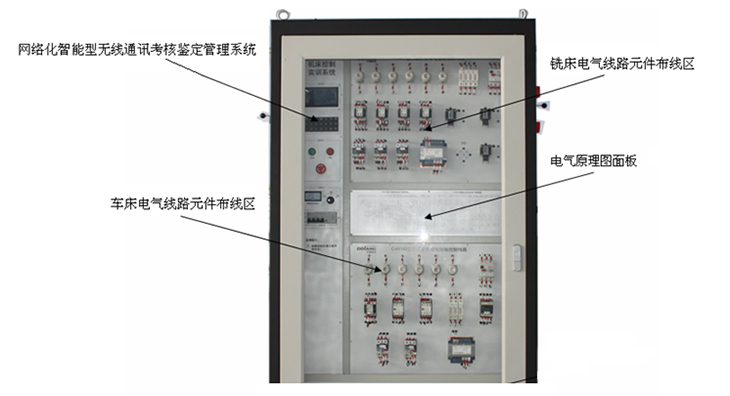 技能實訓考核柜 四個機床操作按鈕及機床指示區面板 四個機床電氣線路元器件布線區 兩個機床轉接模塊區 網絡化智能型機床實訓考核鑒定管理系統 |