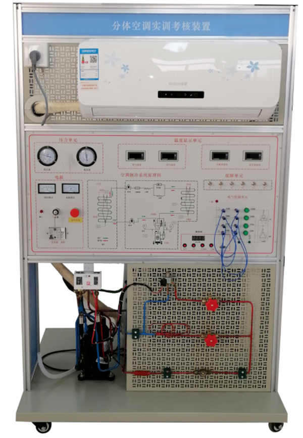 2、裝置直觀展示了空調的系統結構和工作原理,便于教學演示講解及學生對課本知識的理解掌握。配置的交流電壓表、交流電流表、溫度表、真空壓力表以及相應的信號指示燈,使整個空調系統的實時工作狀態一目了然;