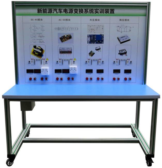 DC-AC模塊(12V轉220V)、點火開關、AC-DC模塊(220V轉12V)、升壓模塊(12V轉24V)、降壓模塊(24V轉12V)、發光二極管閃光燈燈條、指示燈、操作開關、接觸器、急停開關、一體化全鋁合金型材搭建的移動臺架(1500×700×1700mm 帶自鎖腳輪裝置,帶安裝檢測端子的原理面板,面板1448×940mm)、設備操作說明書。